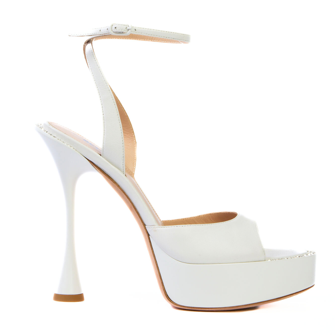 Heeled platform sandal silhouette, metallic leather body, rounded open toe