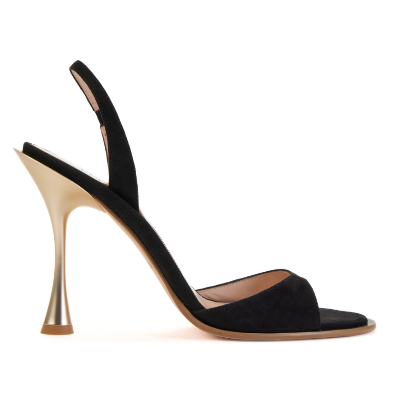 Heeled sandal silhouette, suede leather body, gold-toned metallic heel, rounded, open toe