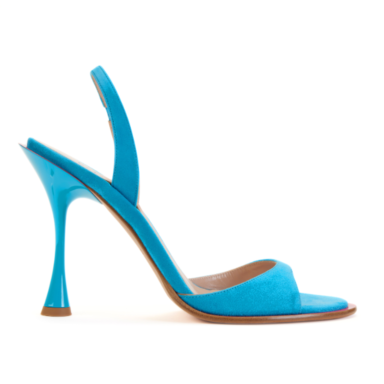 Heeled sandal silhouette, suede leather body, gold-toned metallic heel, rounded, open toe