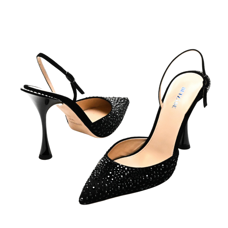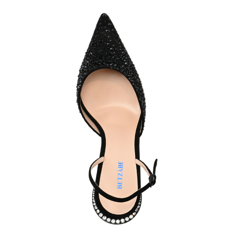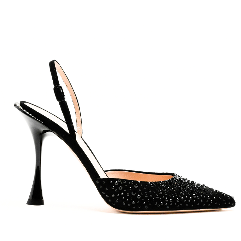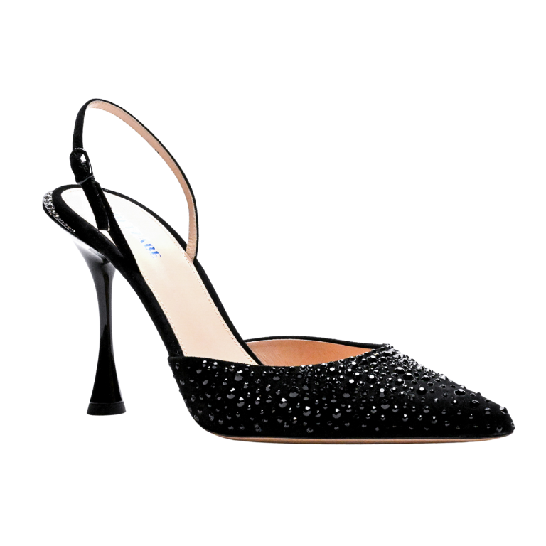 Pump silhouette, suede body, pointed toe, crystal embellishment